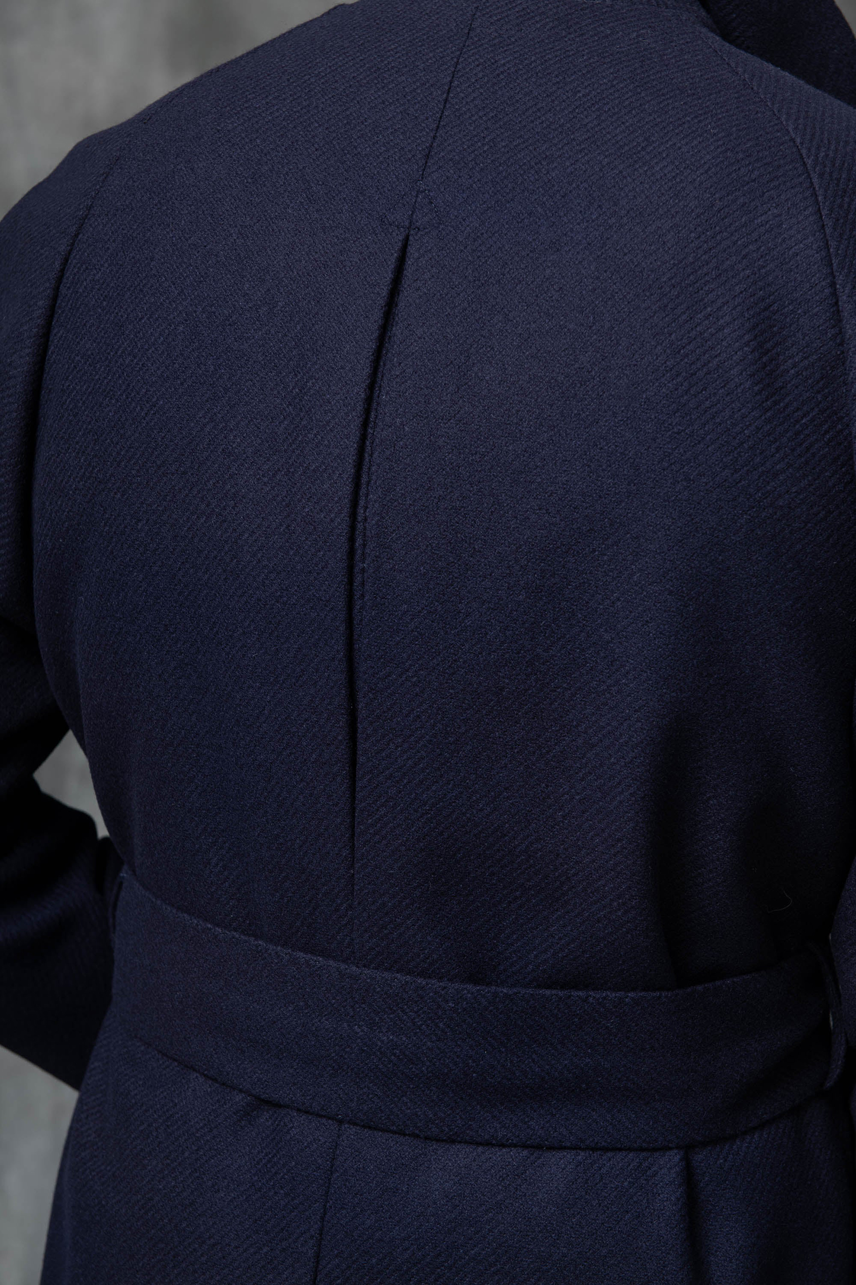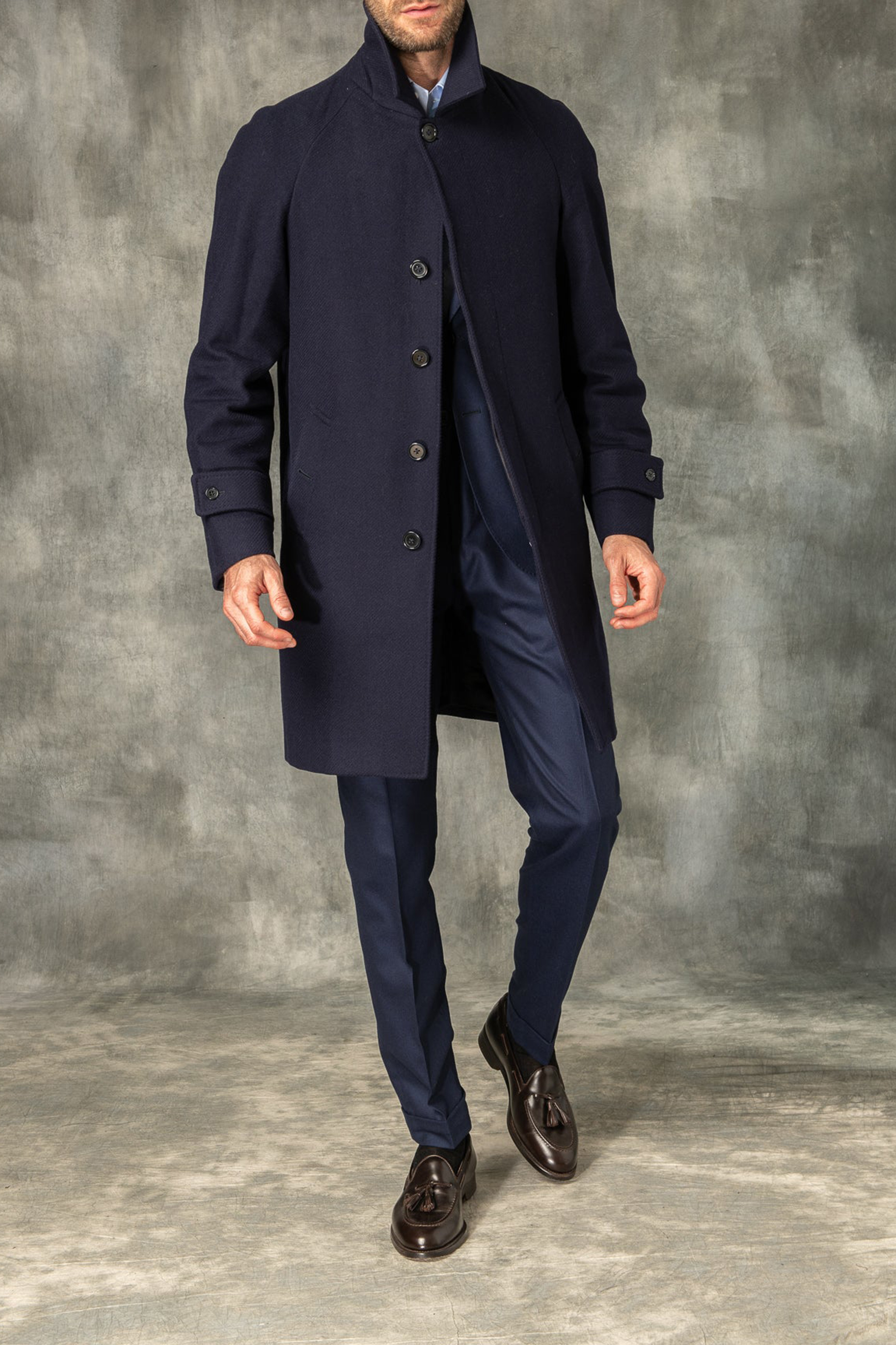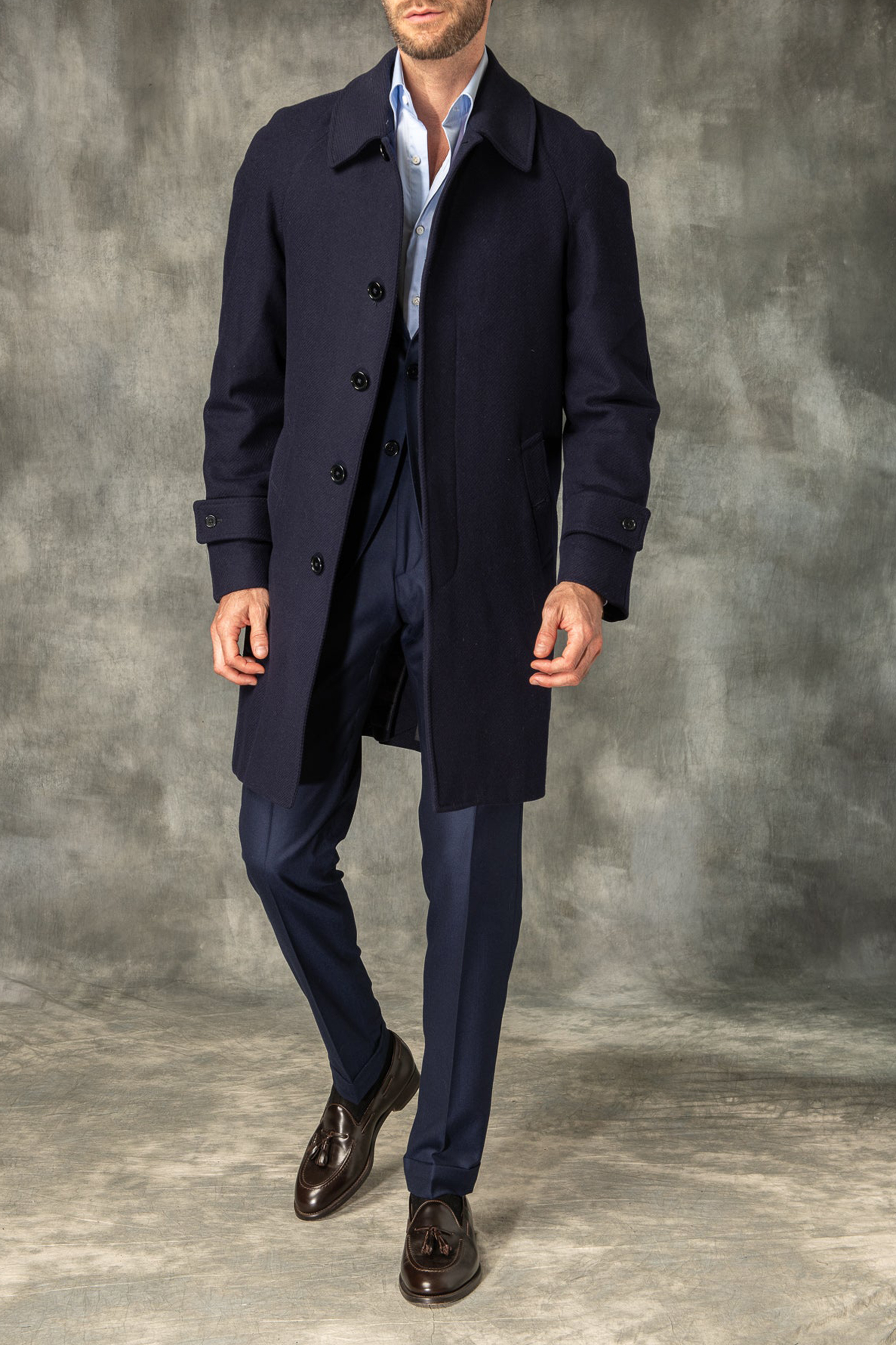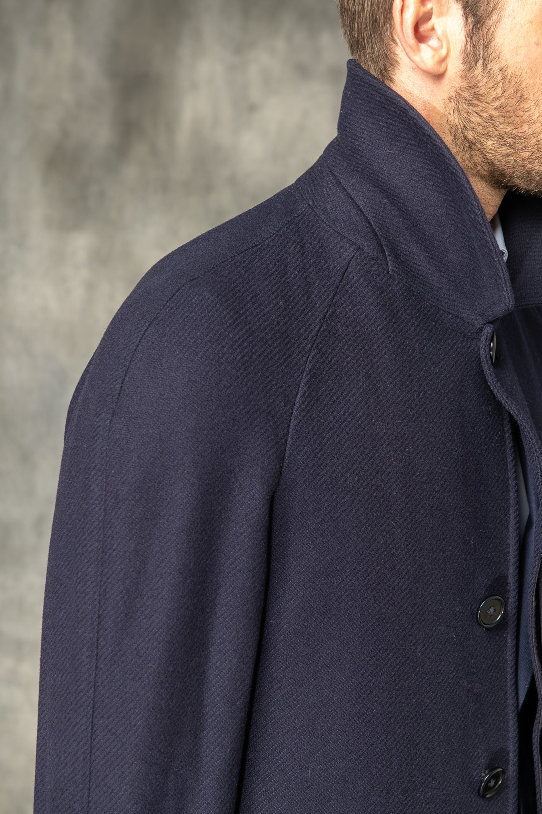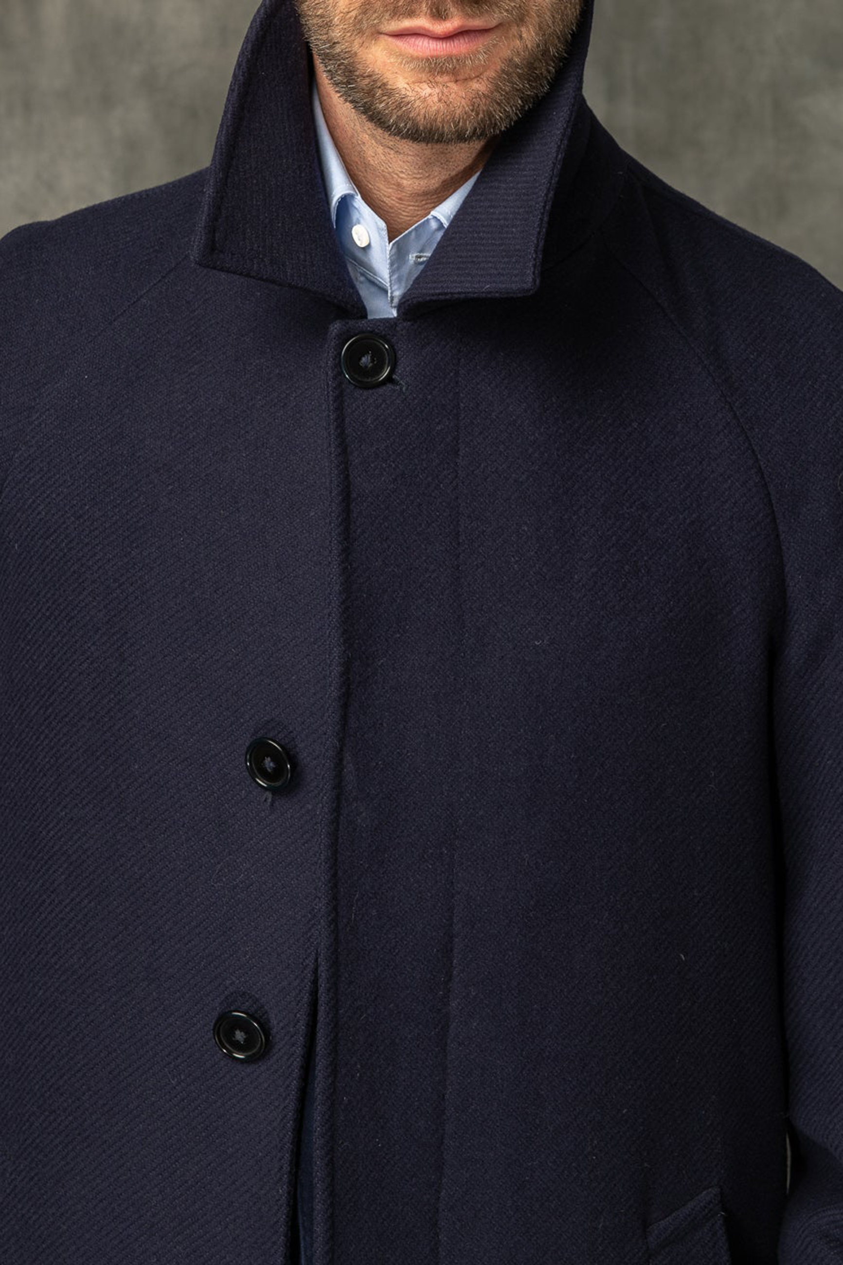 Our raglan coat features a five-button closure up to the neck, a waist belt and diagonal front welt pockets. A box-pleat at the back finishes the piece.