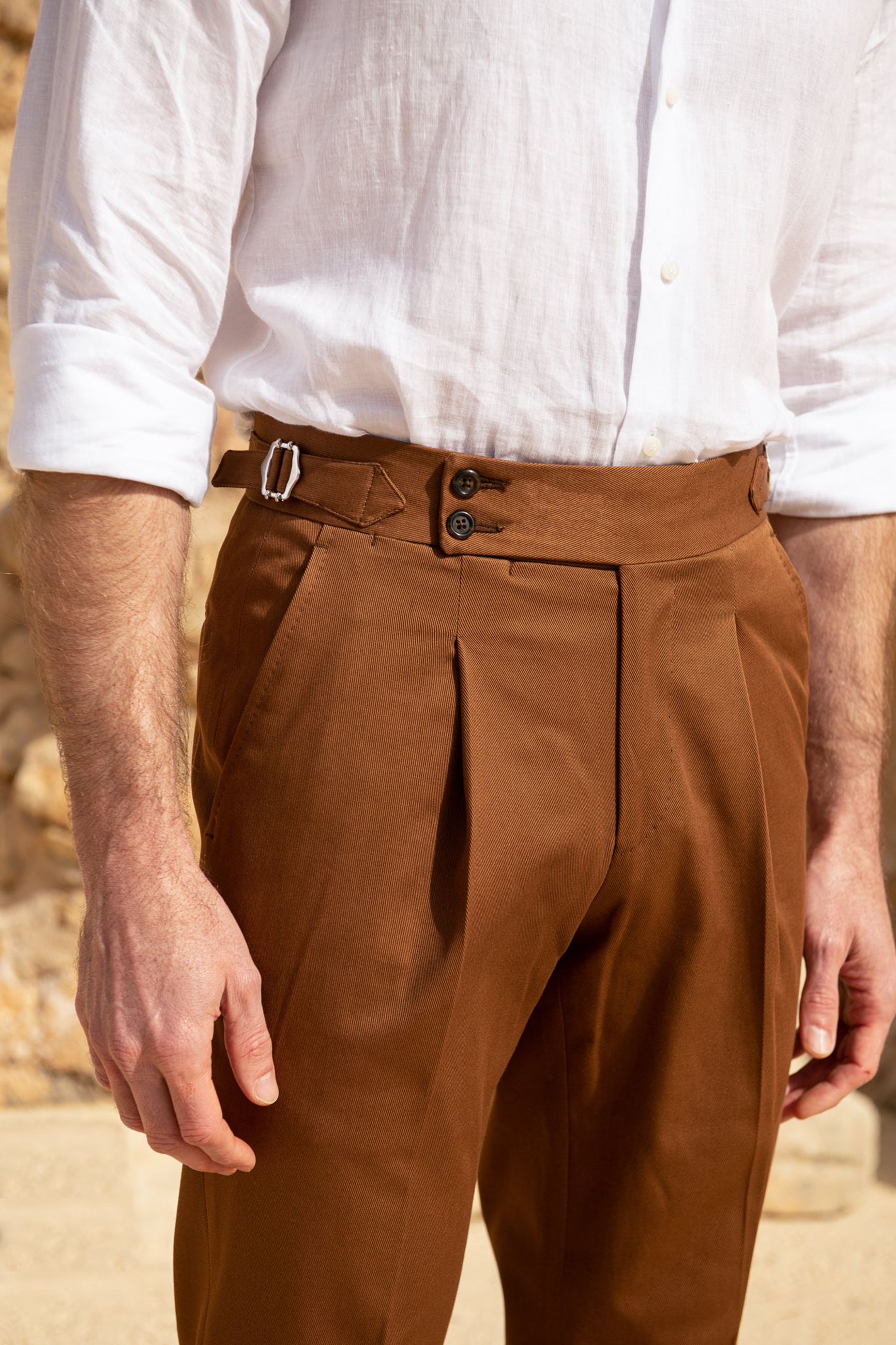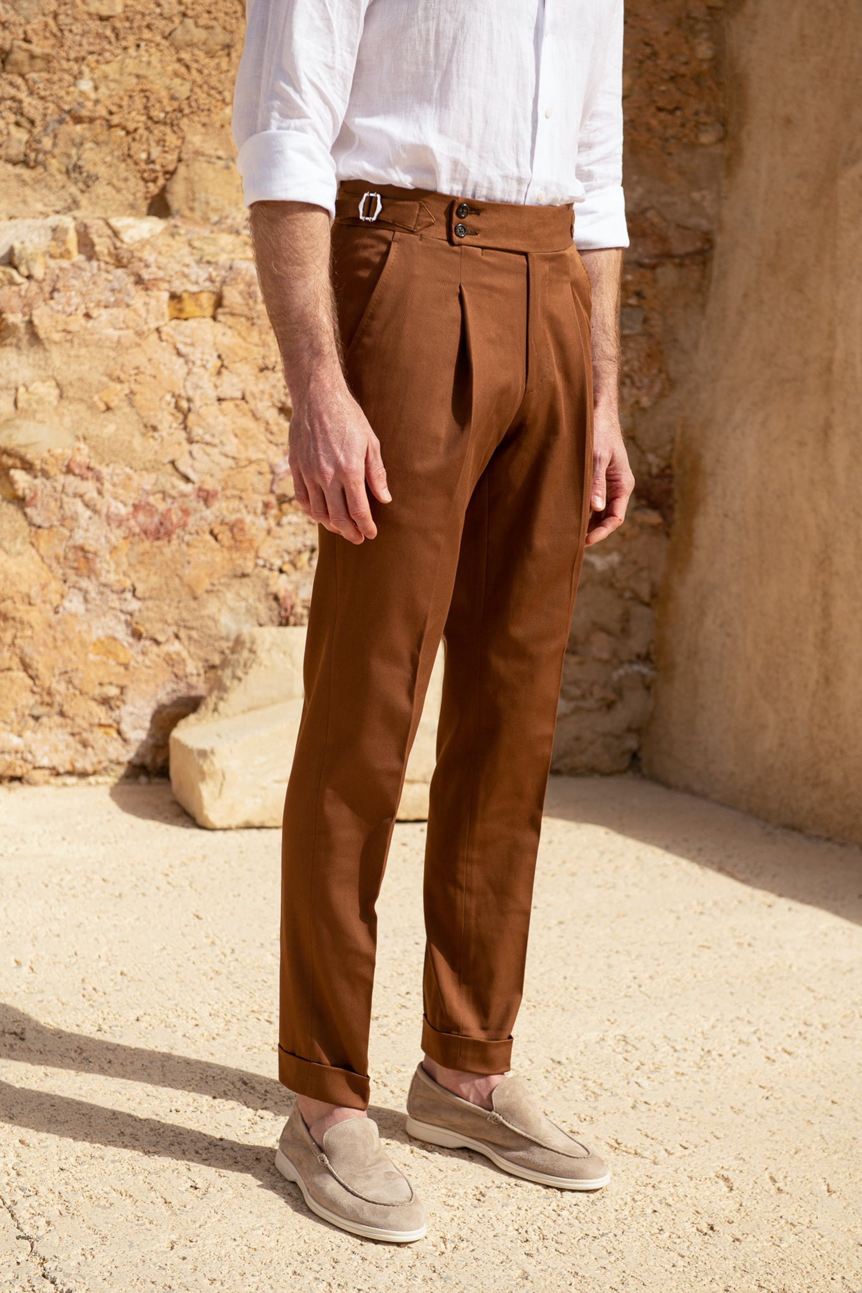 Our iconic Soragna fit features a high-rise and a semi-slim fit, a large extended 2-button belt, side adjusters and single pleats. It is the perfect pair of trousers for any occasion and can easily be dressed up with a shirt, tie and jacket or worn casually with a simple shirt or knit.