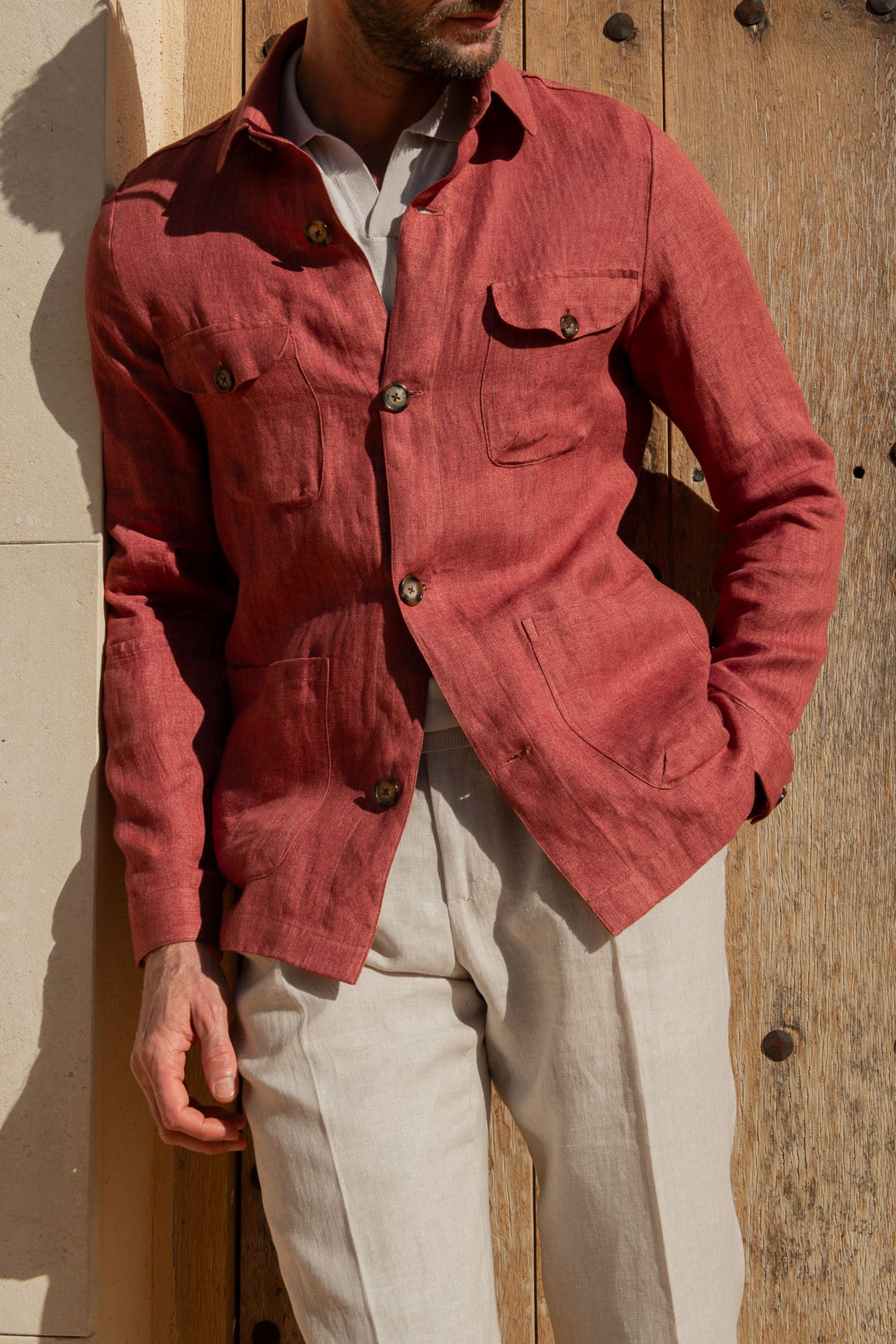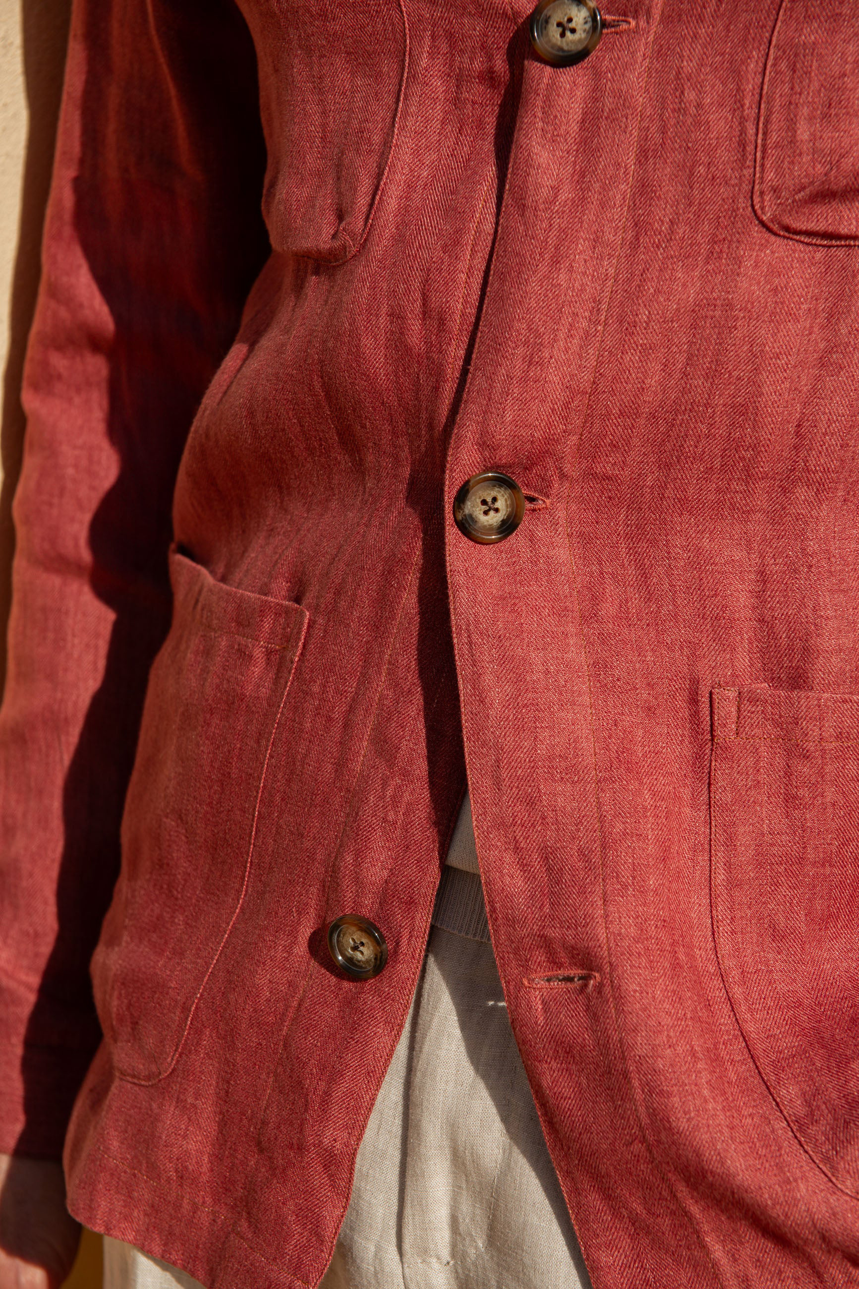 Crafted in Italy from a 100% linen, this unstructured jacket features two flap pockets with buttons on the chest and two patch pockets on the waist, cuffs with a single-button fastening and one internal patch pocket.