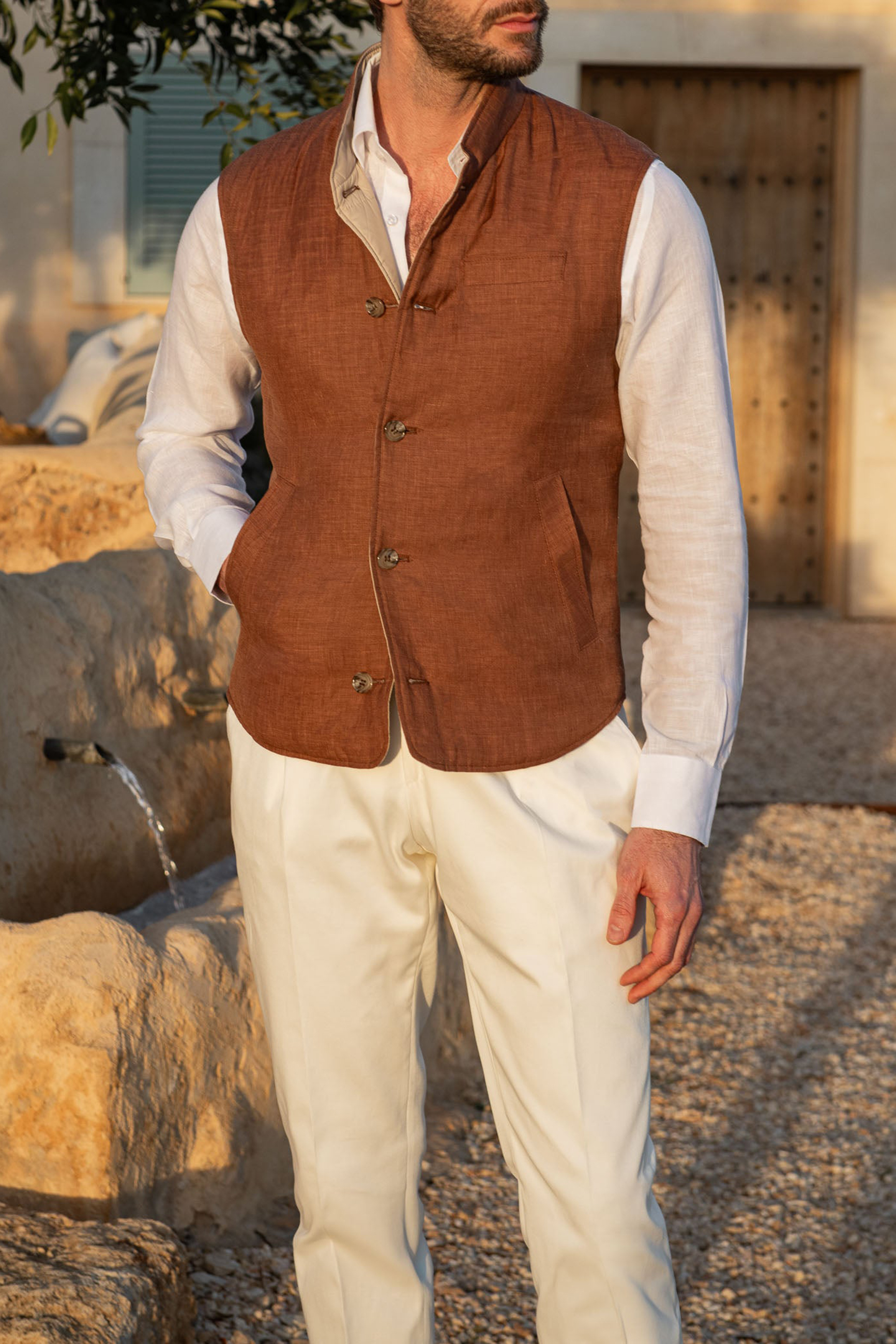 Our vest is the perfect layering piece for spring and will provide warmth and elegance. Crafted in Italy from 100% linen on one side and 100% nylon on the other side, it features a 5 button closure, a chest pocket, side pockets and is perfect when being worn over a light knit and shirt combination.